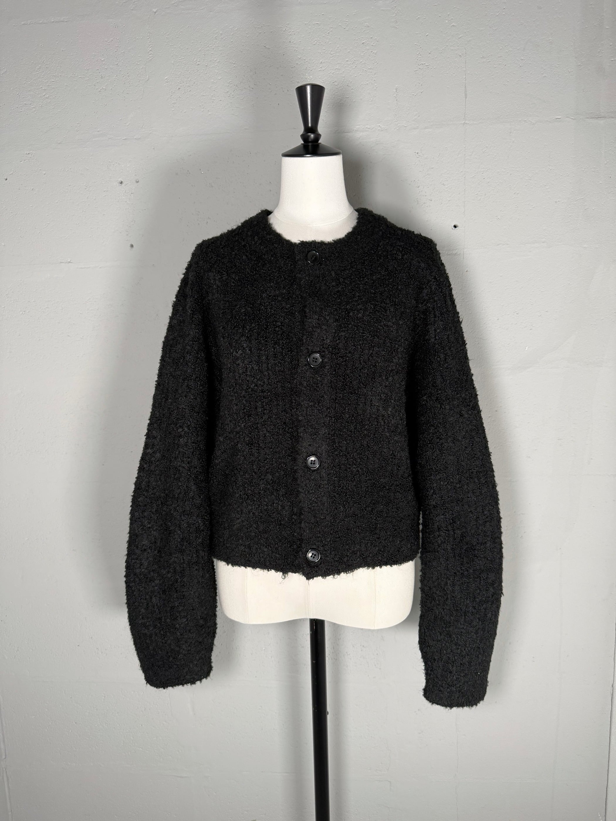 ふんわりとした質感と立体感ある表情が特徴のブークレ素材のカーディガン。